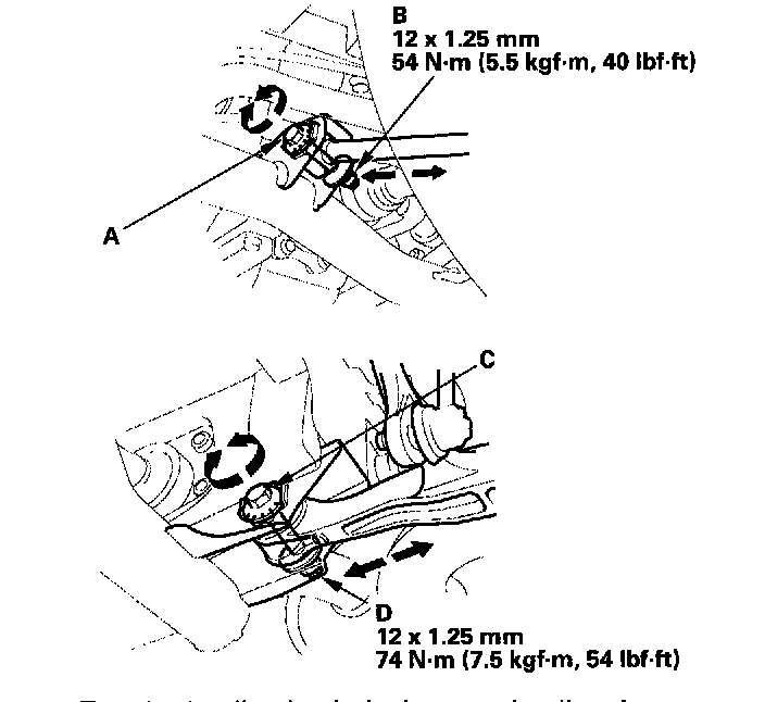 3. Hold the adjusting bolt of the control arm (A) and loosen the self-locking nut (B), and hold the adjusting bolt of the lower arm (C) and loosen the self-locking nut (D).