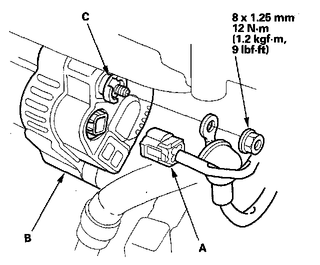 5. Disconnect the 4P connector (A) from the alternator (B), and disconnect the BLK wire from the alternator B terminal (C).