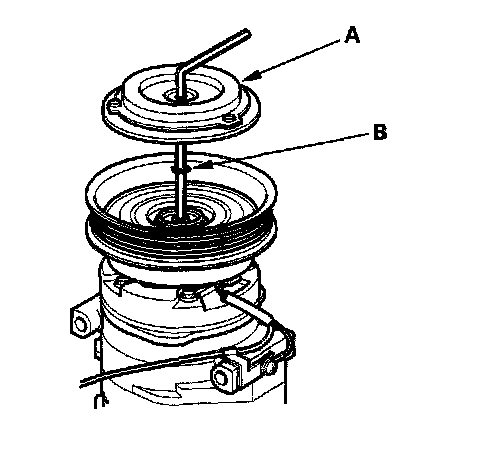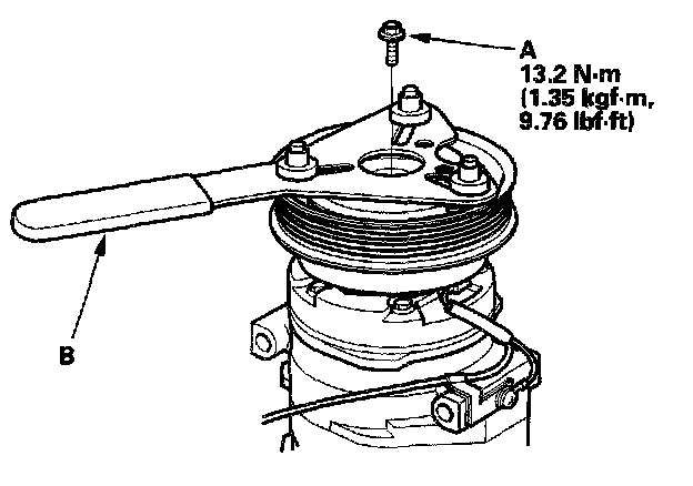 1. Remove the center bolt (A) while holding the pressure plate with a commercially available A/C clutch holder (B).
