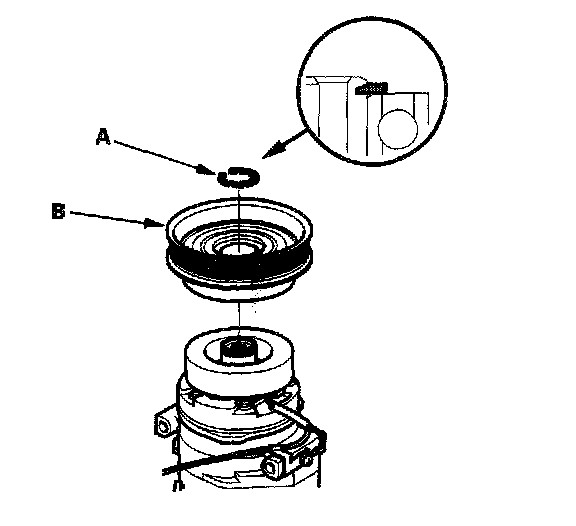 3. If you are replacing the field coil, remove the snap ring (A) with snap ring pliers, then remove the pulley (B). Be careful not to damage the pulley and compressor.