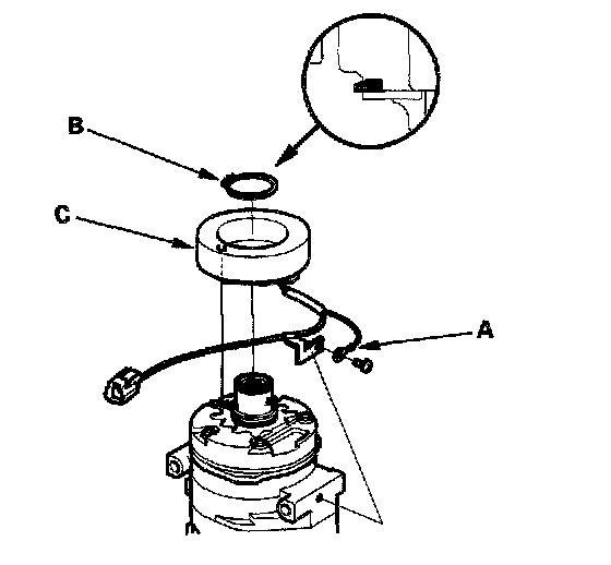 4. Remove the screw from the field coil ground terminal (A). Remove the snap ring (B) with snap ring pliers, then remove the field coil (C). Be careful not to damage the field coil and compressor.