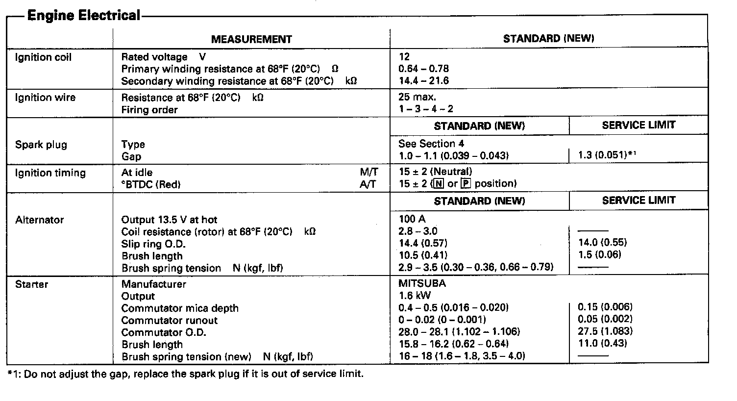 Engine Electrical Specifications: