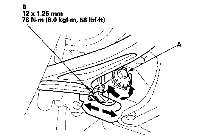 2. Hold the adjusting bolt (A) on the control arm, and loosen the self-locking nut (B).