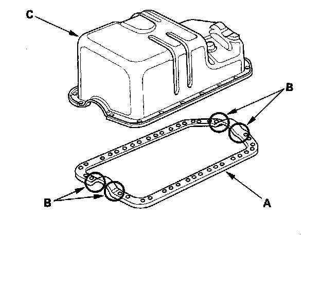 3. Apply liquid gasket, P/N 08718-0001 or 08718-0003, to the new oil pan gasket (A) at the four corners of the recesses (B), then install the oil pan (C).