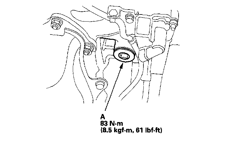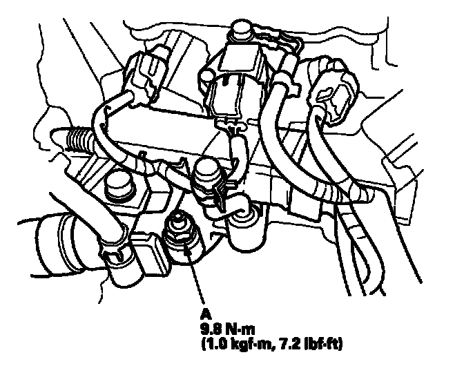 9. Loosen the air bleed bolt (A) in the water outlet, then pour Honda All Season Antifreeze/Coolant Type 2 into the radiator to the bottom of the filler neck. Do not let coolant spill on any electrical parts or the paint. If any coolant spills, rinse it off immediately.