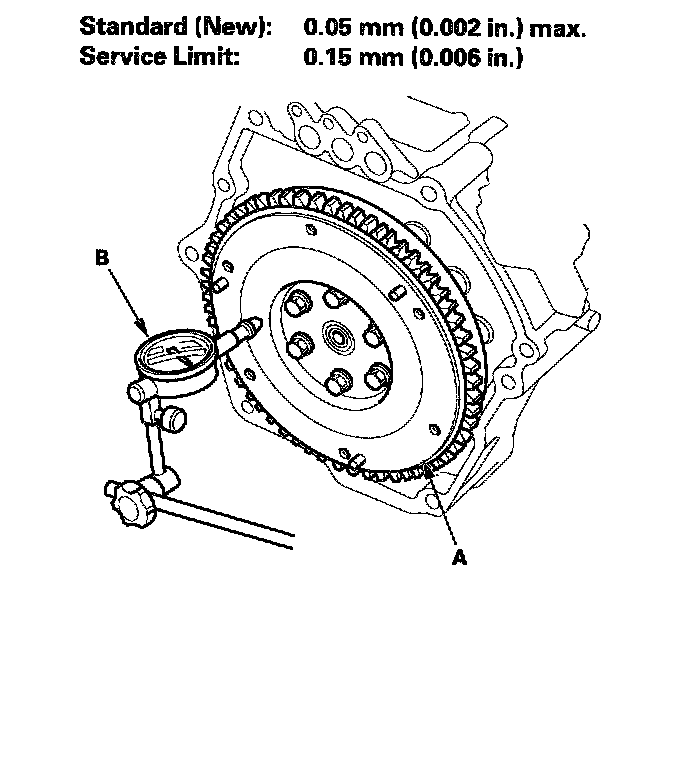 3. Measure the flywheel (A) runout using a dial indicator (B) through at least two full turns engine installed. Push against the flywheel each time you turn it to take up the crankshaft thrust washer clearance. If the runout is more than the service limit, replace the flywheel and recheck the runout. Resurfacing the flywheel is not recommended.