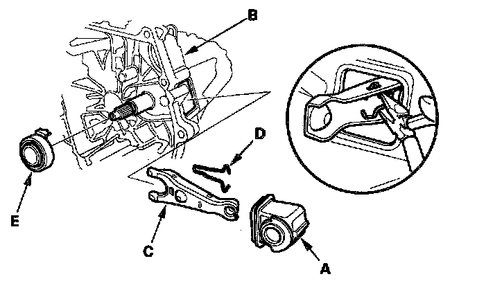 2. Remove the release fork (c) from the clutch housing by squeezing the release fork set spring (D) with pliers. Remove the release bearing (E).