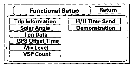 This screen is used to graphically display the sun's position as determined by GPS. The navigation system uses the sun's angle, along with the sunlight sensor to control the driver/passenger A/C air flow. The heat that must be removed by the A/C unit varies, depending on the angle of the sun entering the vehicle. This screen is for factory use only, and should not be adjusted.