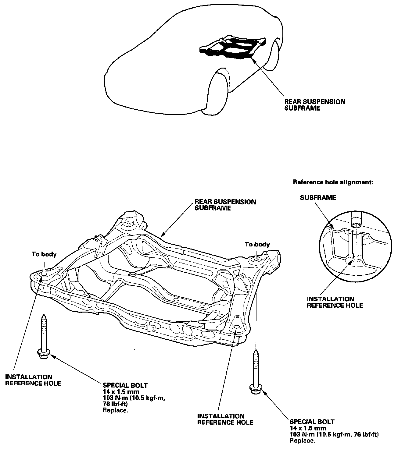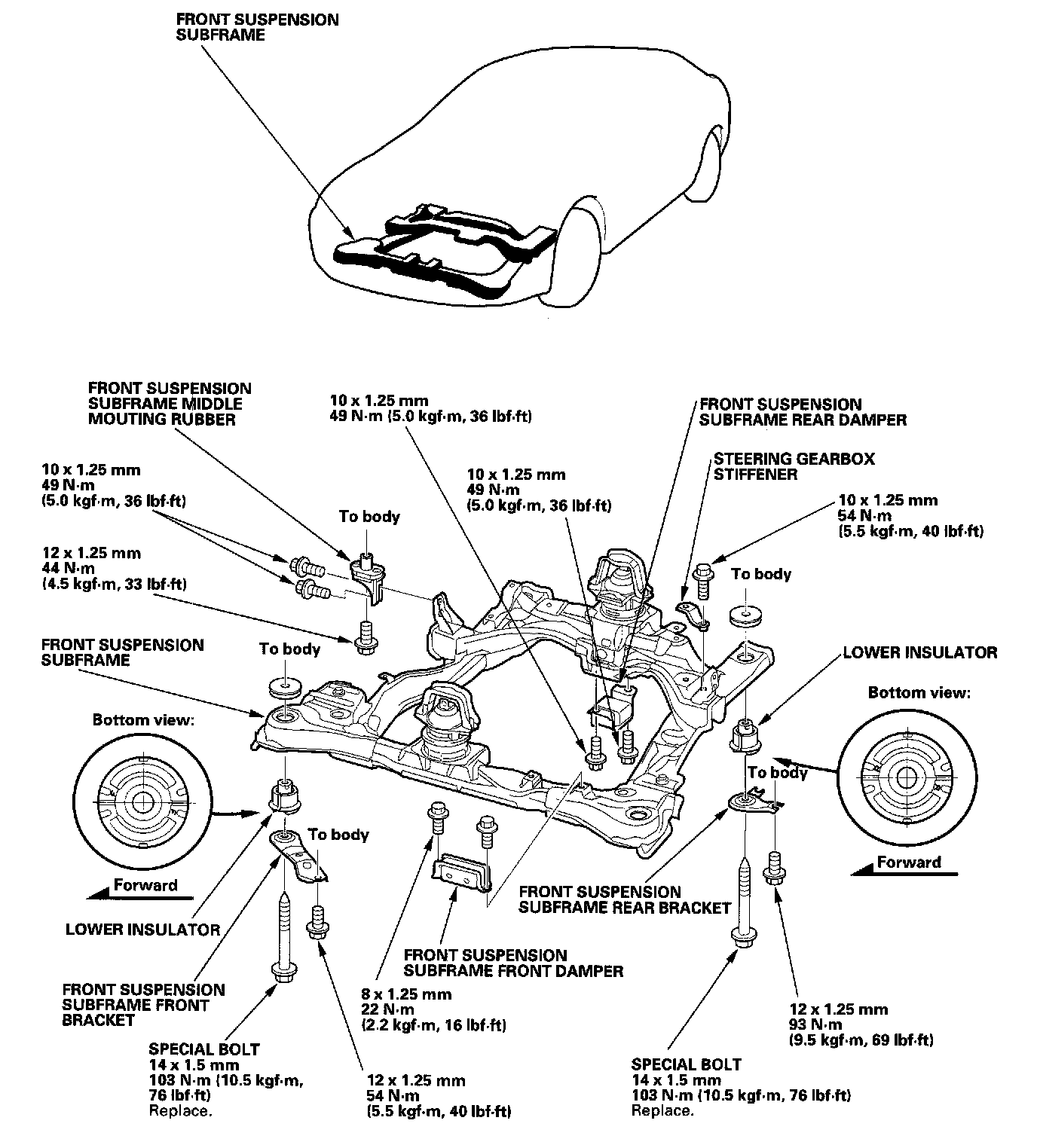 After removing the subframe mounting bolts, be sure to replace them with new ones.