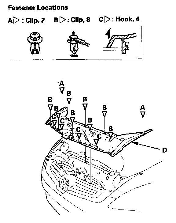 1. Remove the clips (A, B) and detach the hooks (C), then remove the front bulkhead cover (D).