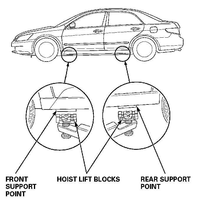 1. Position the hoist lift blocks, or safety stands, under the vehicle's front support points and rear support points.