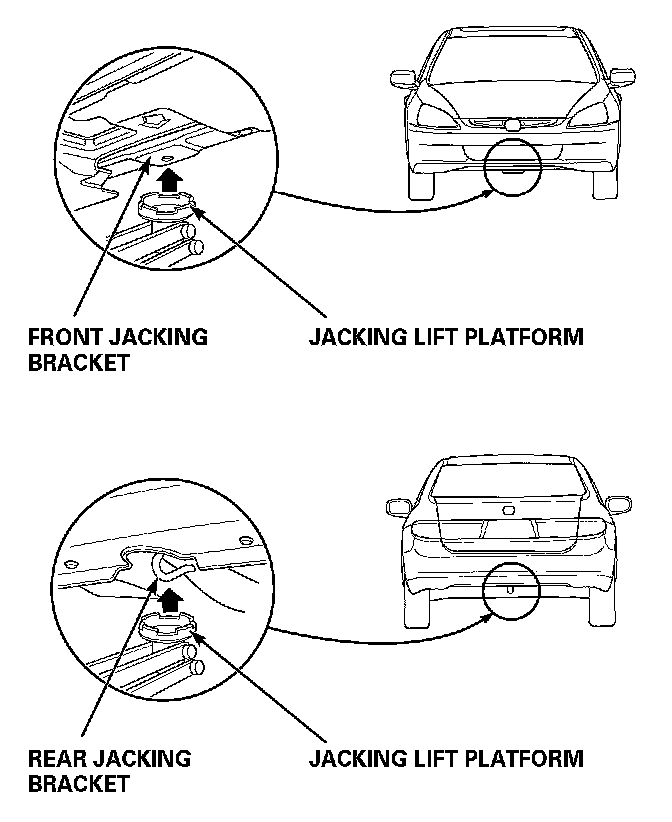 3. Position the floor jack under the front jacking bracket or rear jacking bracket, center the jacking bracket in the jack lift platform, and jack up the vehicle high enough to fit the safety stands under it.