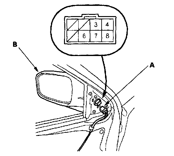2. Disconnect the 8P connector (A) from the power mirror actuator (B).