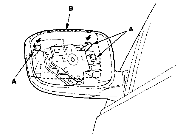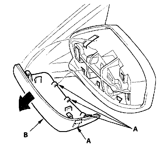 1. Remove the mirror holder.2. From the mirror holder opening, release the hooks (A) of the mirror housing cover (B).