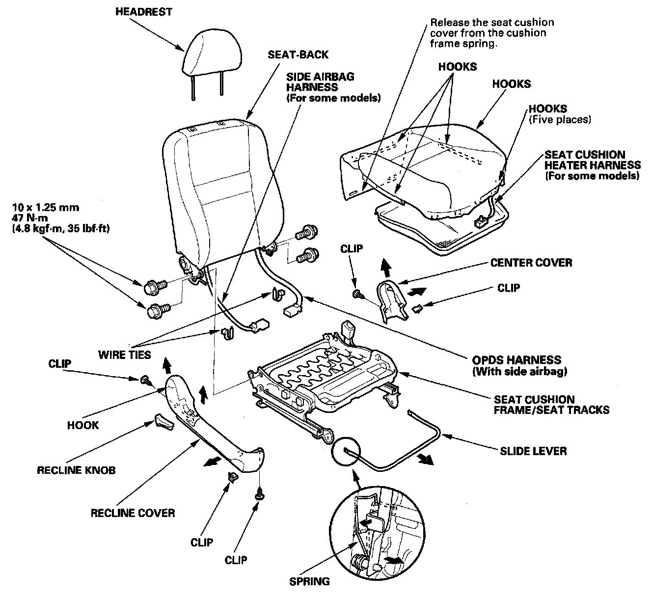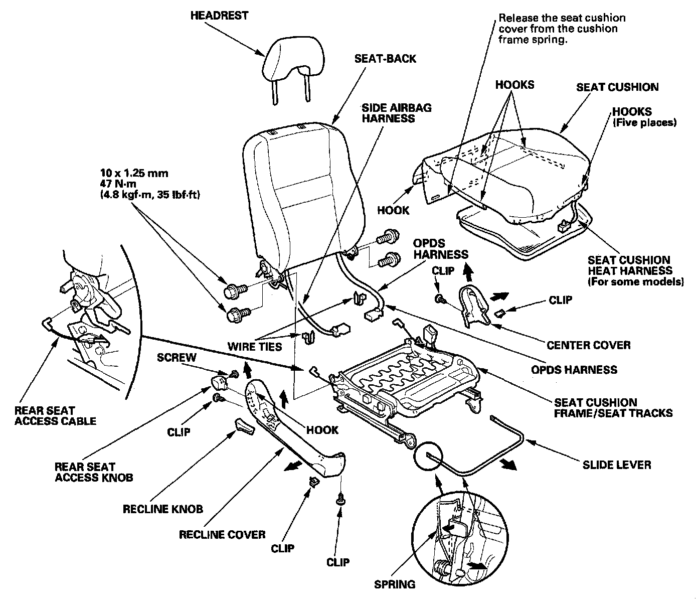 - The passenger's seat is shown; the driver's seat is similar except it has no OPDS unit.