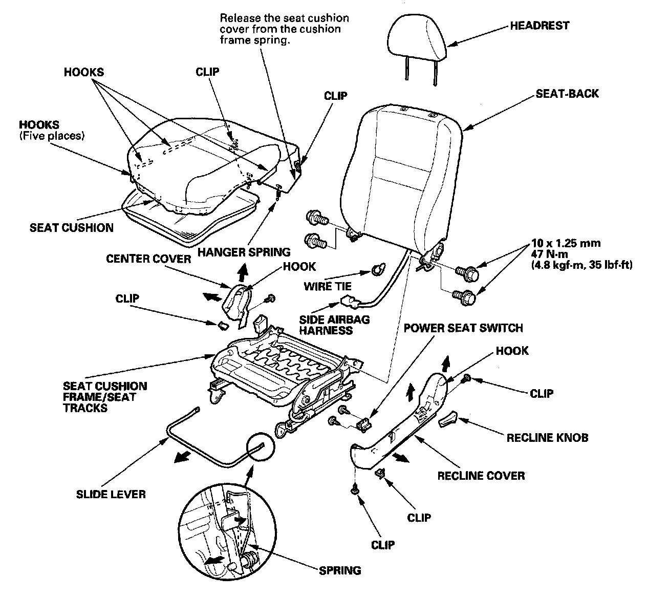 Front Seat Disassembly/Reassembly - 2-Way PowerFor some models: SRS components are located in this area. Review the SRS component locations, and the precautions and procedures in the SRS section before performing repairs or service.