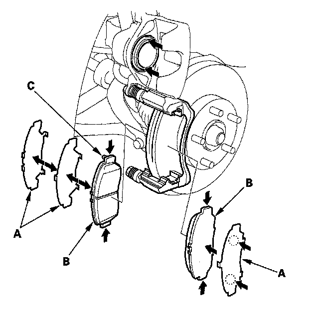 Install the brake pads with the wear indicator (C) on the inside. The wear indicator should be on the top ofthe pad.