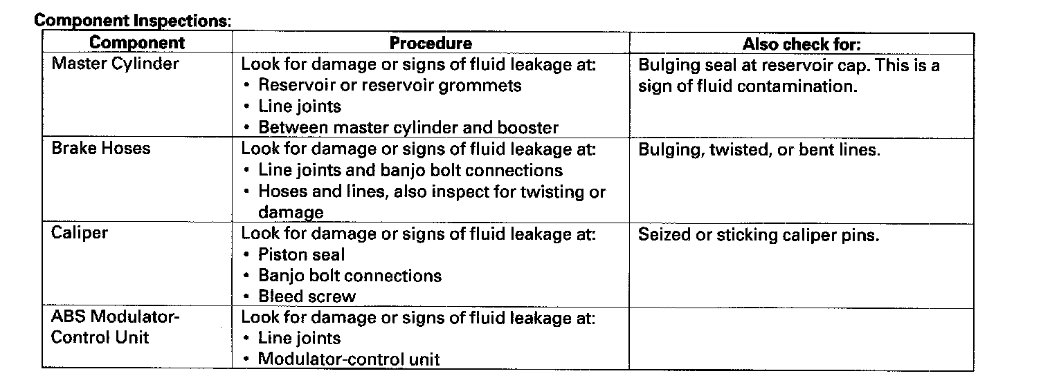 Brake System Inspection and TestInspect the brake system components listed. Repair or replace any parts that are leaking or damaged.