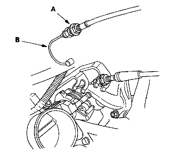 1. Loosen the locknut (A), then remove the cruise control cable (B) from the throttle linkage.