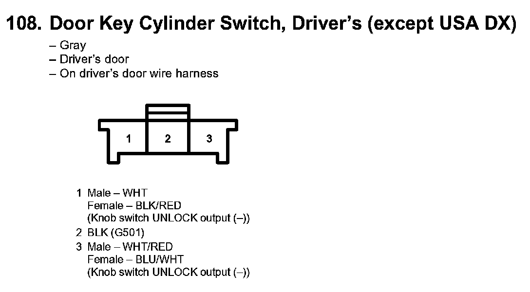 108. Door Key Cylinder Switch, Driver's (except USA DX):