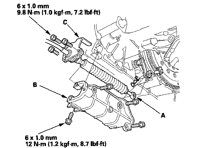 44. 2006-2007 models: Install the strut brace (A), then install the harness clamp (B) and bolt (C).
