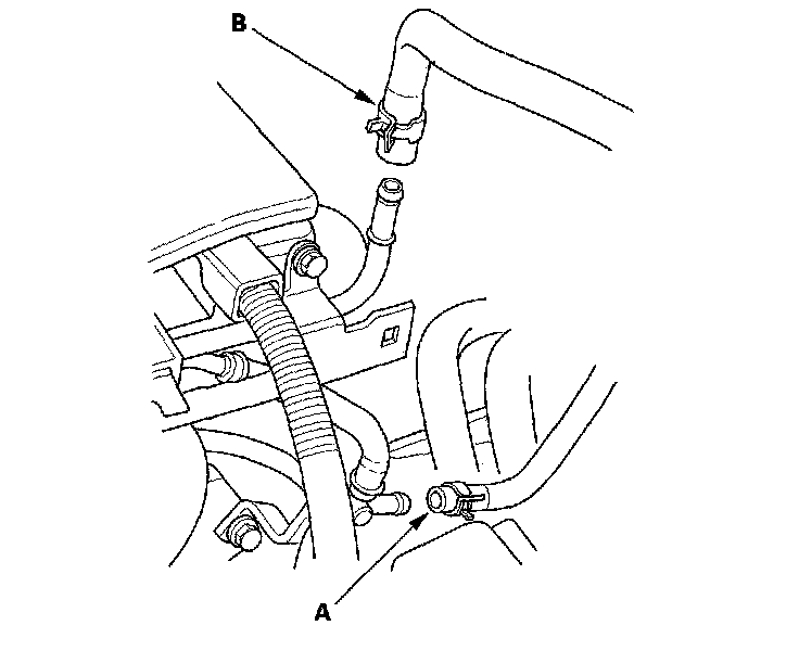 28. Install the upper radiator hose (A) and heater hoses (B).
