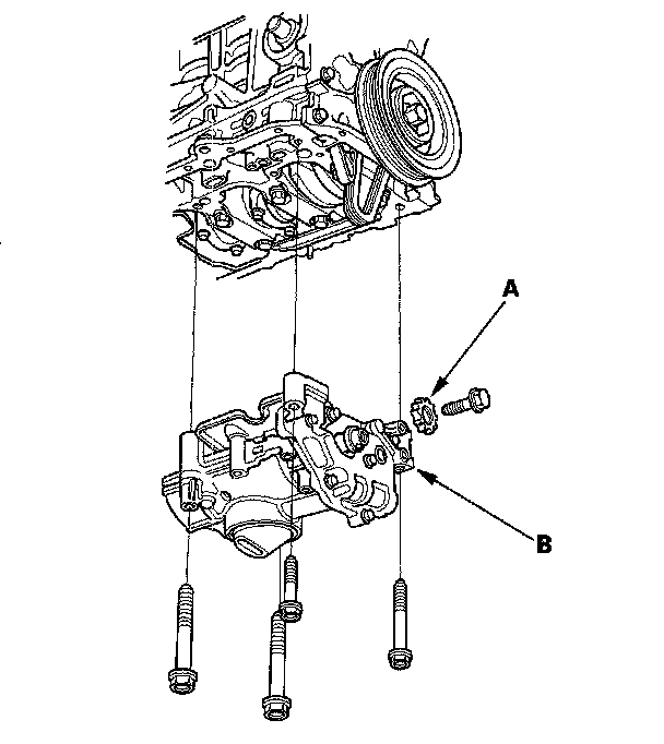 6. Remove the oil pump sprocket (A), then remove the oil pump (B).