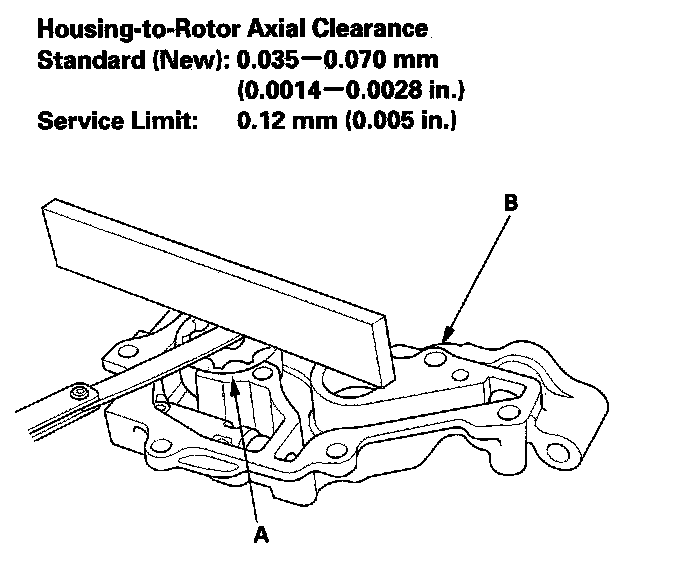 3. Check the housing-to-rotor axial clearance between the rotor (A) and pump housing (B). If the housing-to-rotor axial clearance exceeds the service limit, replace the oil pump.