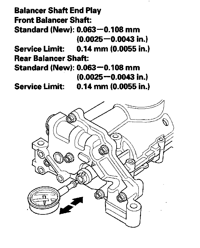 2. Zero the dial indicator against the end of the balancer shaft, then push the balancer shaft back and forth and read the end play.