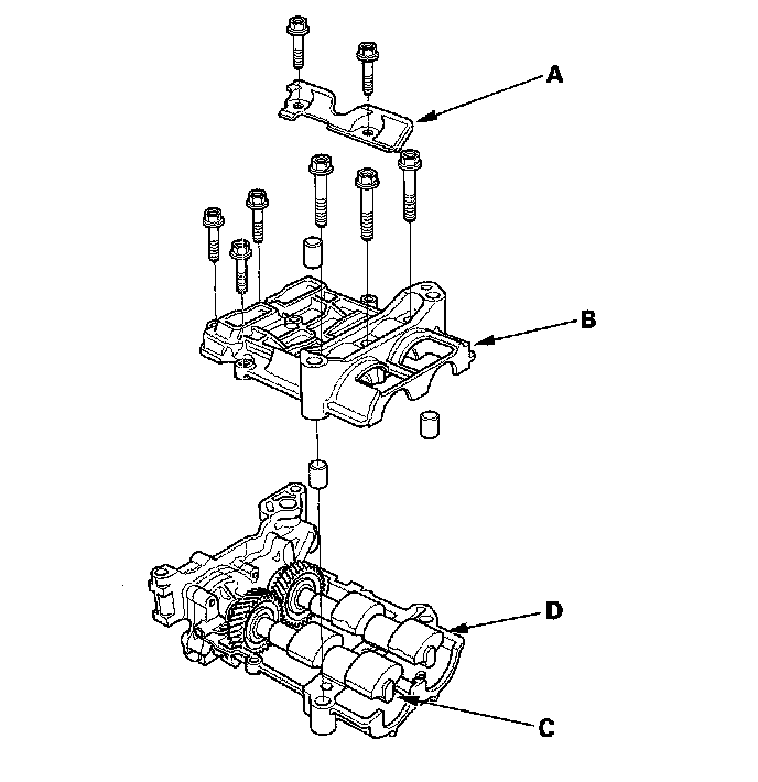3. Remove the baffle plate (A) and upper balancer shaft holder (with bearings) (B), then remove the front balancer shaft (C) and rear balancer shaft (D).