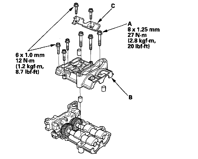 12. Install the upper balancer shaft holder (B) and baffle plate (C).