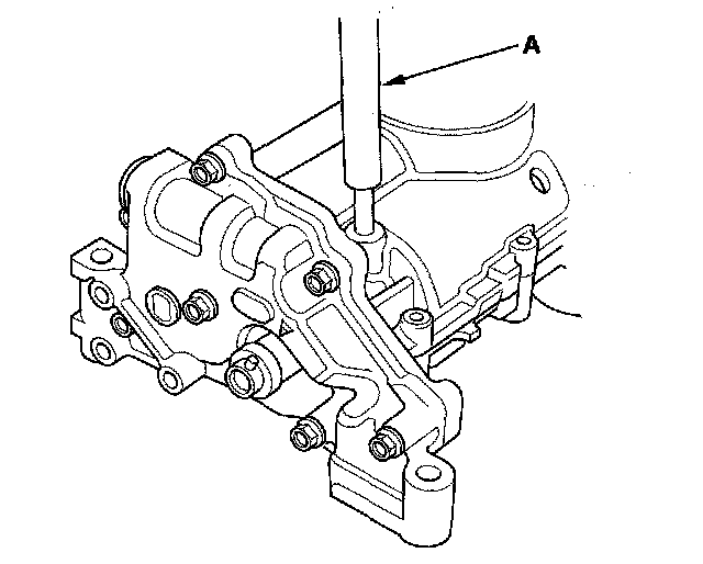 3. To hold the rear balancer shaft, insert a 6 mm pin driver (A) into the maintenance hole in the lower balancer shaft holder and through the rear balancer shaft.