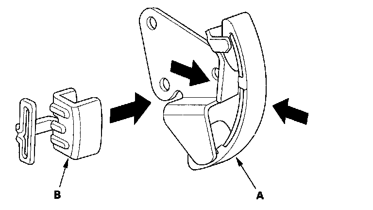 8. Squeeze the new oil pump chain tensioner (A), then install the set clip (B) on it as shown.