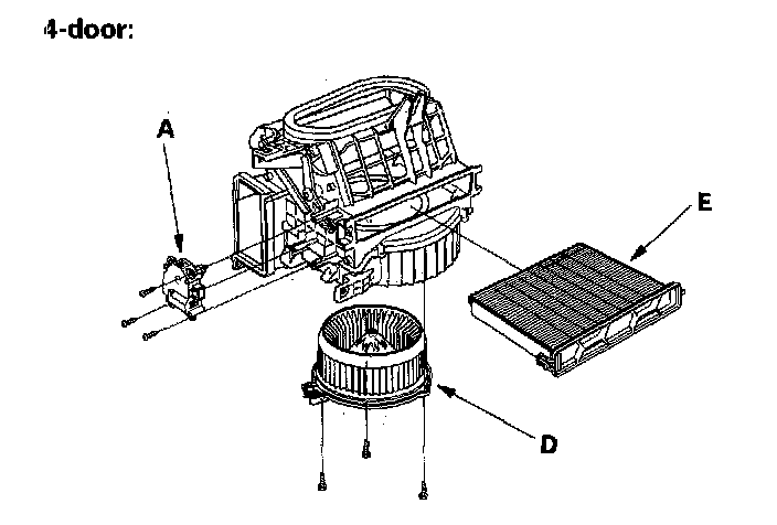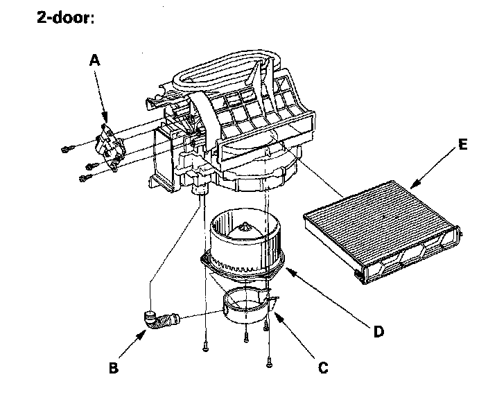 - The recirculation control motor (A), blower motor cooling hose (B) (2-door), blower motor cover (C) (2-door), the blower motor (D) and the dust and pollen filter (E) can be replaced without removing the blower unit.