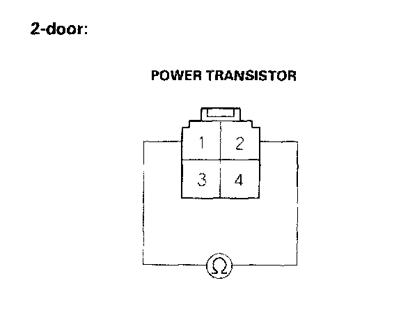 2. Measure the resistance between the No.3 and No.4 (4-door) or No.1 and No.2 (2-door) terminals of the power transistor. It should be about 1.4 - 1.5 kOhms.