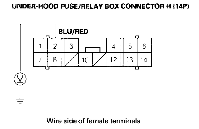 13. Measure the voltage between the No.2 terminal of under-hood fuse/relay box connector H (14P) and body ground with the under-hood fuse/relay box connectors connected.
