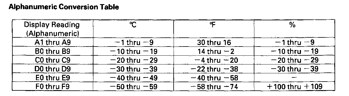 - The sensor values will be displayed in degrees Celsius (°C) or an alphanumeric code. Use the chart to convert the value to degrees Fahrenheit (°F).