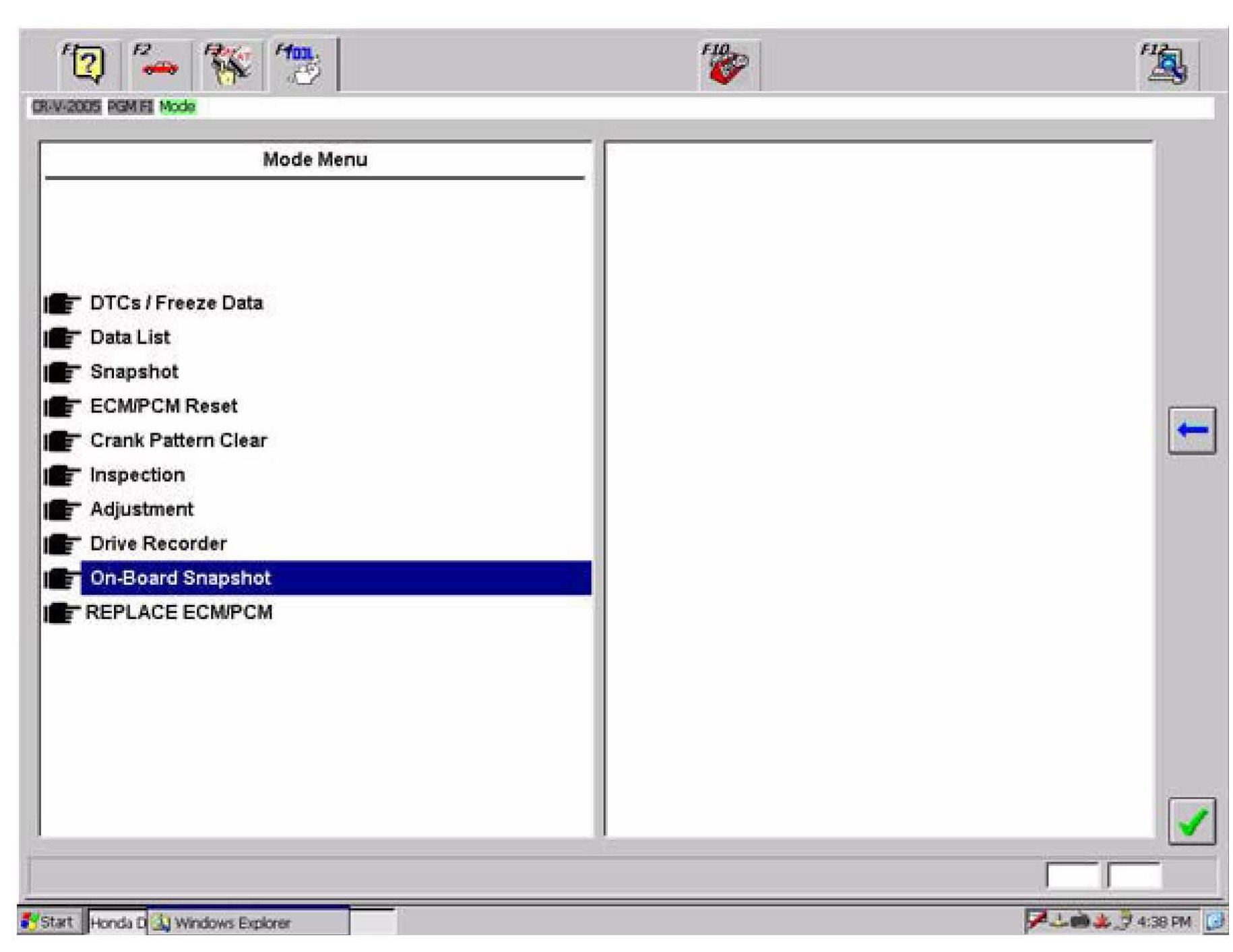 5. From the Mode Menu, select On-Board Snapshot. If the ECM/PCM has data from a earlier DTC, the HDS will download and store it. After the download is finished, you can then change the trigger type.