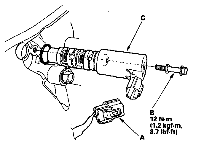 2. Remove the bolt (B) and the VTC oil control solenoid valve (C).