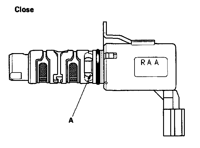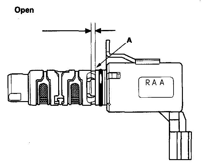 4. Note the amount of valve opening by observing the position of the piston shoulder (A) through the valve retard drain port. If it opens, replace the VTC oil control solenoid valve.