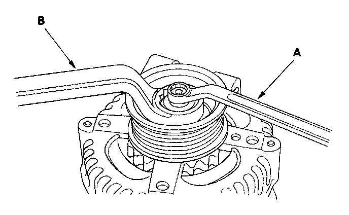 3. It the front bearing needs replacing, remove the pulley locknut with a 10 mm wrench (A) and a 22 mm wrench (B). If necessary, use an impact wrench.