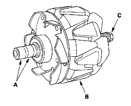 15. Check that there is no continuity between each slip ring and the rotor (B) and the rotor shaft (C).