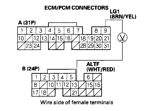 7. Measure voltage between ECM/PCM connector terminals A9 and B13.