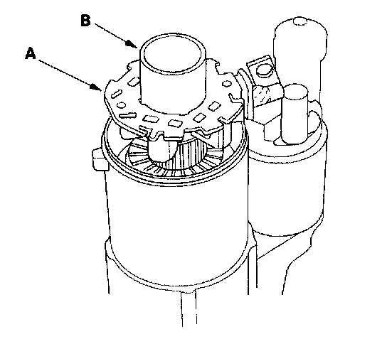 19. If the starter drive gear (B) is worn or damaged, replace the overrunning clutch assembly; the gear is not available separately. Check the condition of the flywheel ring gear to see, if the starter drive gear teeth are damaged.