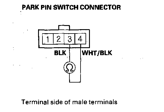 9. Check for continuity between the No. 3 and No. 4 terminals of the park pin switch connector while pushing the button of the shift lever in, and when released.
