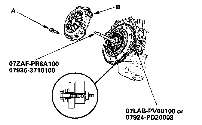 3. To prevent warping, unscrew the pressure plate mounting bolts (A) in a crisscross pattern in several steps, then remove the pressure plate (B).