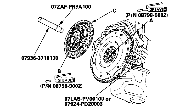 4. Apply super high temp urea grease (P/N 08798-9002) to the splines (B) of the clutch disc (C), then install the clutch disc using the special tools.
