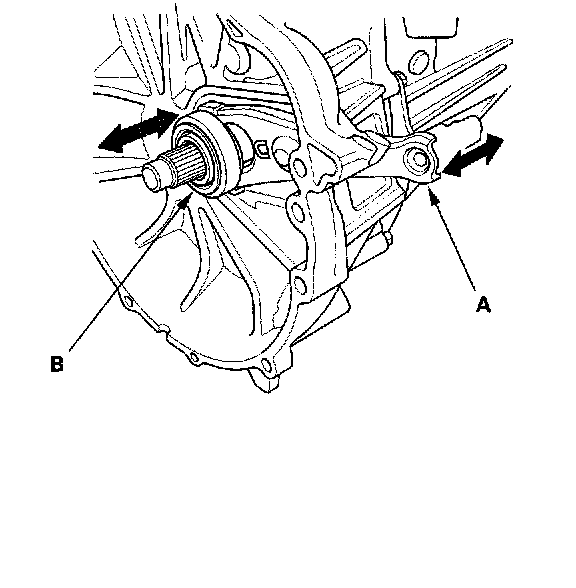 8. Move the release fork (A) right and left to nuke sure that it fits properly against the release bearing (B) and that the release bearing slides smoothly.
