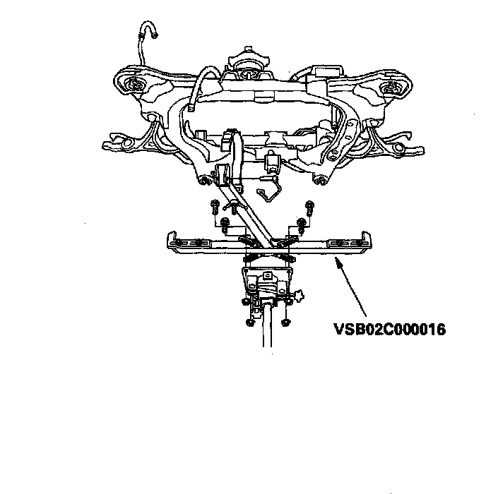 12. Align the reference marks (A) with edge (B) of both rear stiffer (C), and tighten the rear subframe mounting bolts, then front bolts, and tighten the stiffener bolts to the specified torque.