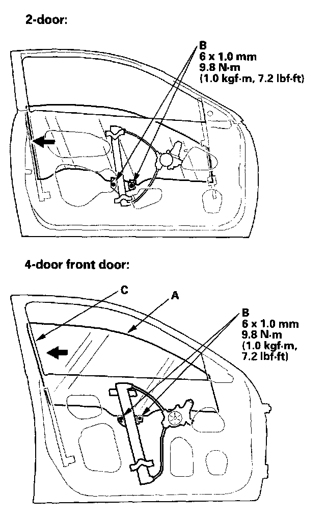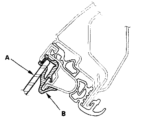 6. Raise the glass fully, and check for gaps. Also check that the glass (A) contacts the glass run channel (B) evenly.